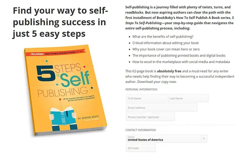 Typically delivered as PDF downloads, the above are informative guides that help your audience solve problems or achieve goals. In this example, Book Baby offers a free guide to self-publishing. The guide promises real value, it’s targeted to Book Baby’s audience, it will undoubtedly mention how Book Baby can help and it’s just the beginning of what will likely be a strong lead nurturing campaign.
