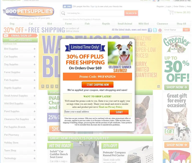 Instant coupon codes are excellent lead magnets. Even if coupons don’t persuade people to buy today, you can use automated email marketing to reach out to subscribers until they do. In this example, 1800 Pet Supplies offers an instant, yet time-limited, coupon code and gives customers the opportunity to subscribe if they want to use the coupon code later.